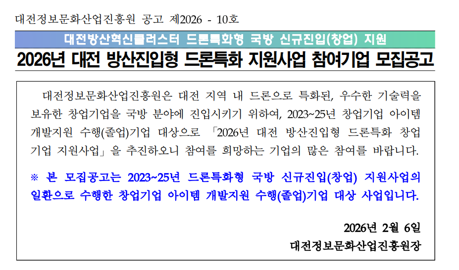 2026년 대전 방산진입형 드론특화 지원사업 참여기업 모집공고