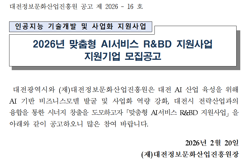 2026년 맞춤형 AI서비스 R&BD 지원사업 지원기업 모집공고