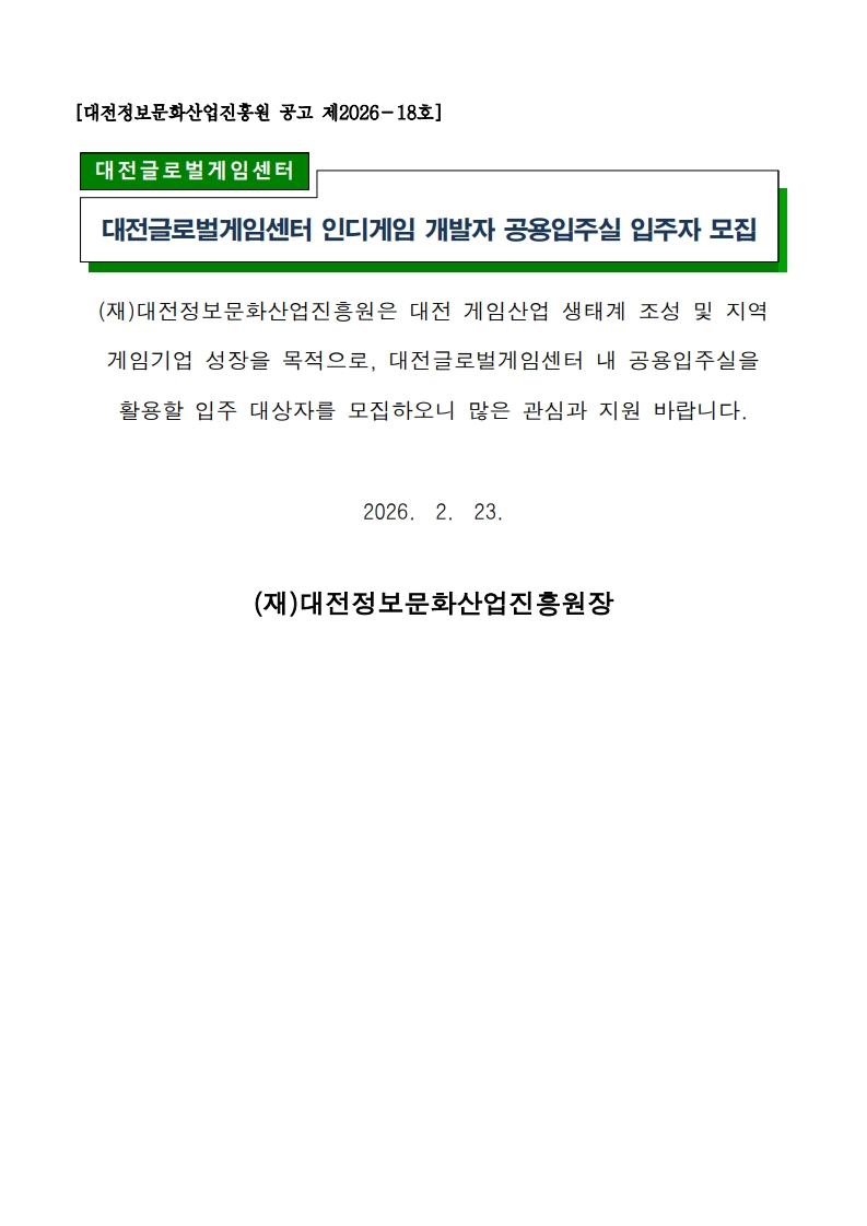 대전정보문화산업진흥원 공고 제 2026-18호