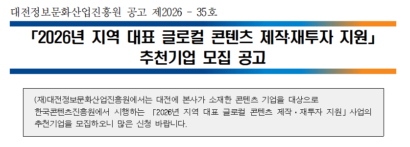 「2026년 지역 대표 글로컬 콘텐츠 제작.재투자 지원」 추천기업 모집 공고