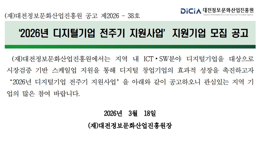 - '2026년 디지털기업 전주기 지원사업' 지원기업 모집 공고