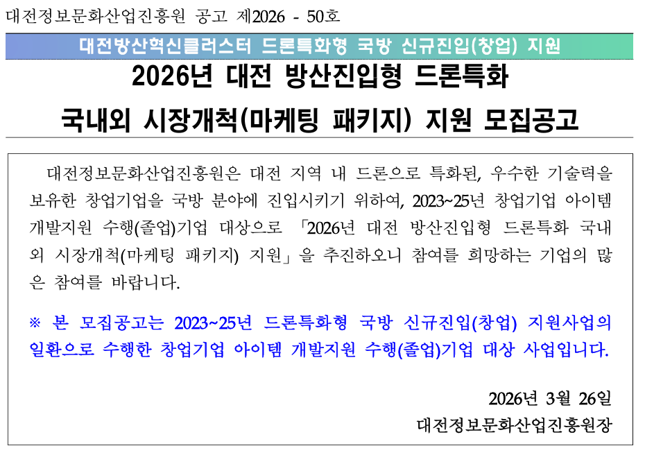 2026년 대전 방산진입형 드론특화 국내외 시장개척(마케팅 패키지) 지원사업 참여기업 모집 재공고