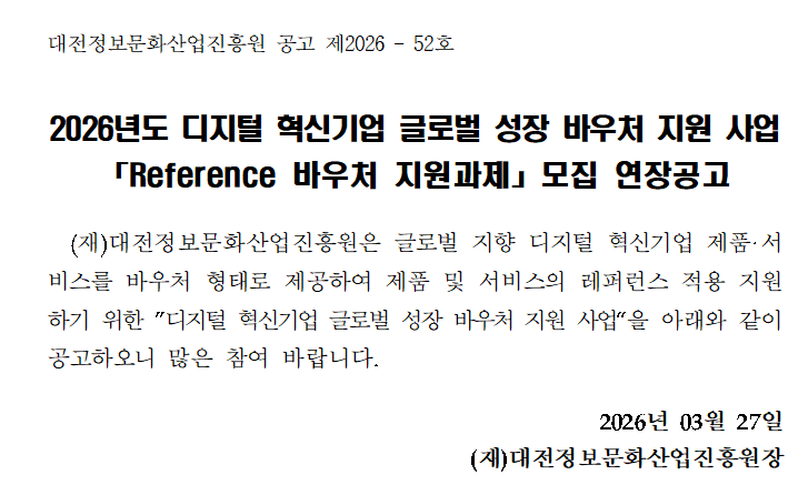 2026년 디지털 혁신기업 글로벌 성장 바우처 지원 사업 Reference 바우처 지원과제 연장 공고