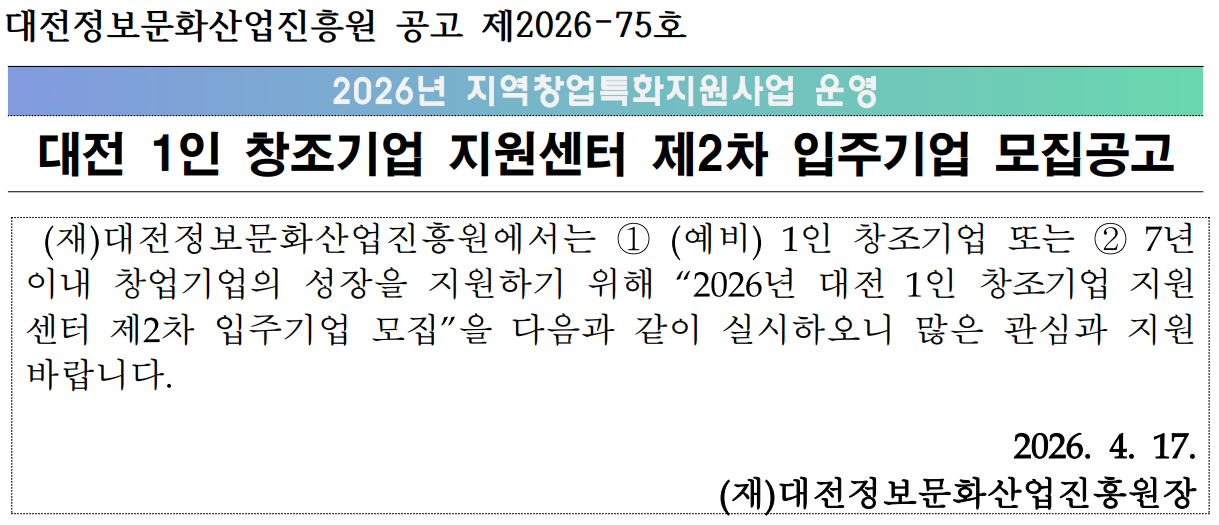 대전정보문화산업진흥원 공고 제 2026-75호